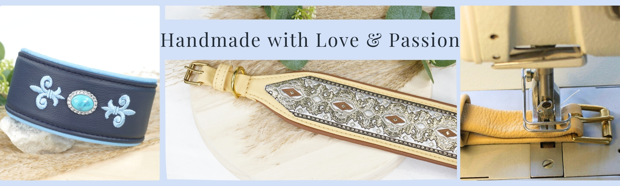 In the standard version, I use chrome-plated snap hooks. Upon request and for a small additional charge, I can also craft the leashes with brass fittings (gold-colored).